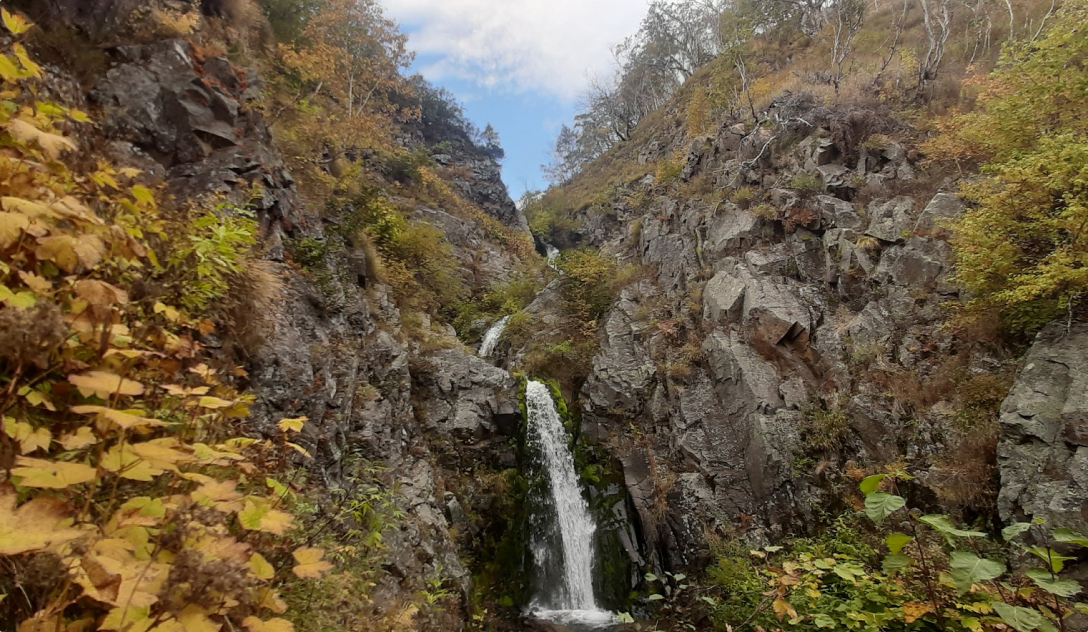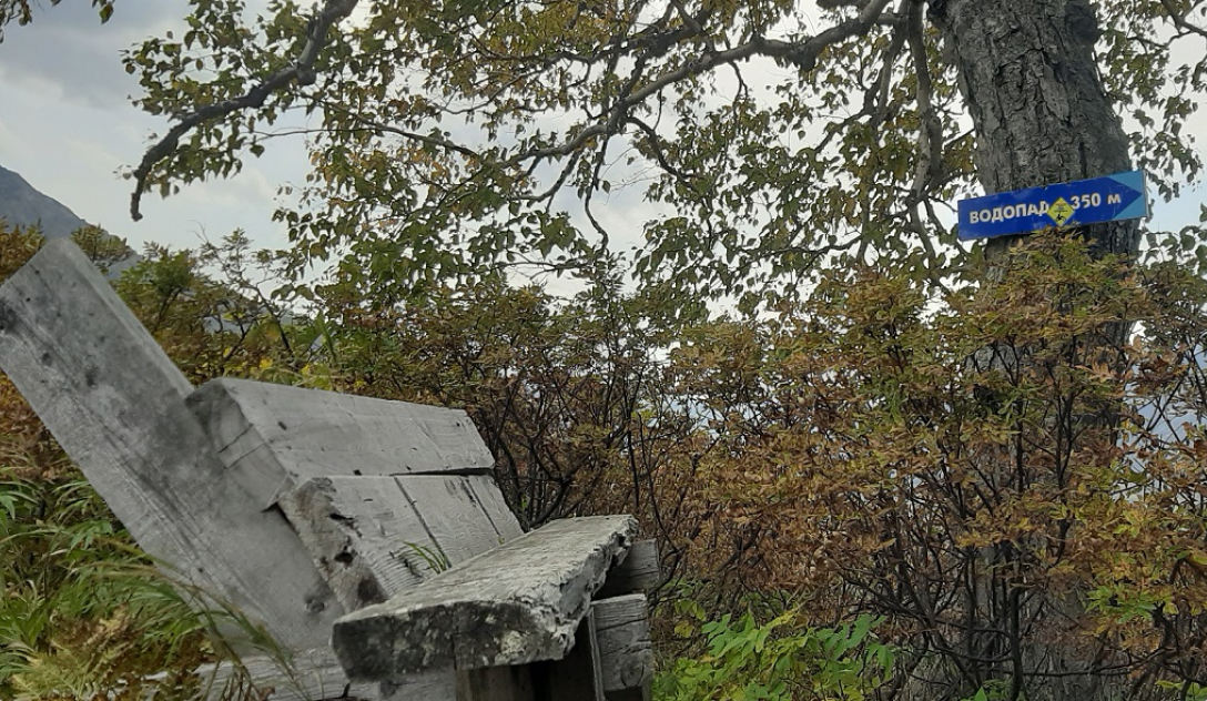 Перед началом подъёма есть старая скамейка и указатель «Водопад 350 м». За скамейкой развилка, вправо узкая тропа ведёт на водопад. Далее 350 м подъём, есть крутые участки тропы.